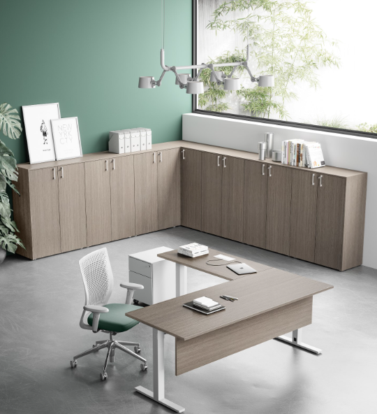 Yes, our L-shaped office tables come with a side cabinet that includes one swing door cabinet with a lock and key and two open shelves. You can also discuss additional storage options during your consultation to customize the table to your needs.