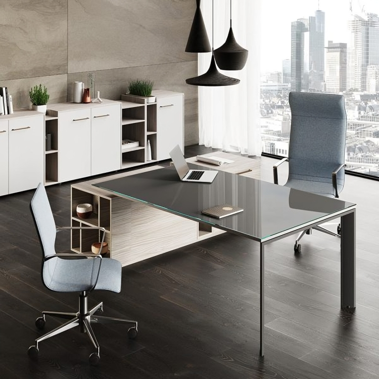 Yes, our L-shaped office tables come with a side cabinet that includes one swing door cabinet with a lock and key and two open shelves. You can also discuss additional storage options during your consultation to customize the table to your needs.